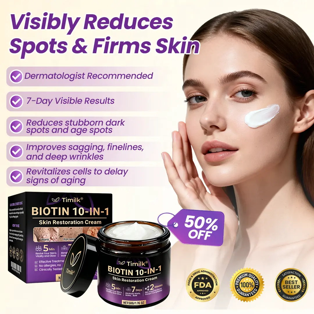 Timilk® Biotin 10-in-1 Skin Restoration Cream combines advanced research and powerful ingredients like Biotin to rejuvenate and repair your skin. This formula boosts skin elasticity, reduces fine lines, and improves texture and tone, with up to 20 times the potency of traditional skincare. Packed with natural bioactive compounds, it hydrates, enhances collagen production, and restores firmness, while addressing uneven skin tone and dryness. Manufactured to U.S. and EU quality standards, this non-invasive, daily-use cream delivers visible results safely and effectively, maintaining youthful, radiant skin.