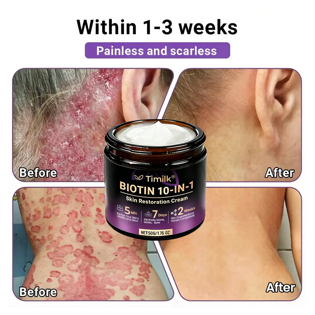 In response, Timilk® Biotin 10-in-1 Skin Restoration Cream was scientifically developed under rigorous standards. Its formula combines the restorative power of natural biotin and collagen, synergized with hyaluronic acid, vitamin C, centella asiatica, and over ten other potent bioactive ingredients. Together, they deliver multi-dimensional care — from deep hydration and barrier repair to anti-inflammatory relief, itch control, metabolic renewal, tissue restoration, and anti-aging nourishment. Clinically validated and produced in GMP-certified facilities compliant with U.S. and EU safety standards, this cream offers a safe, effective, and drug-free multi-repair skincare solution for dryness, inflammation, irritation, and signs of aging — restoring comfort, resilience, and lasting skin health.
