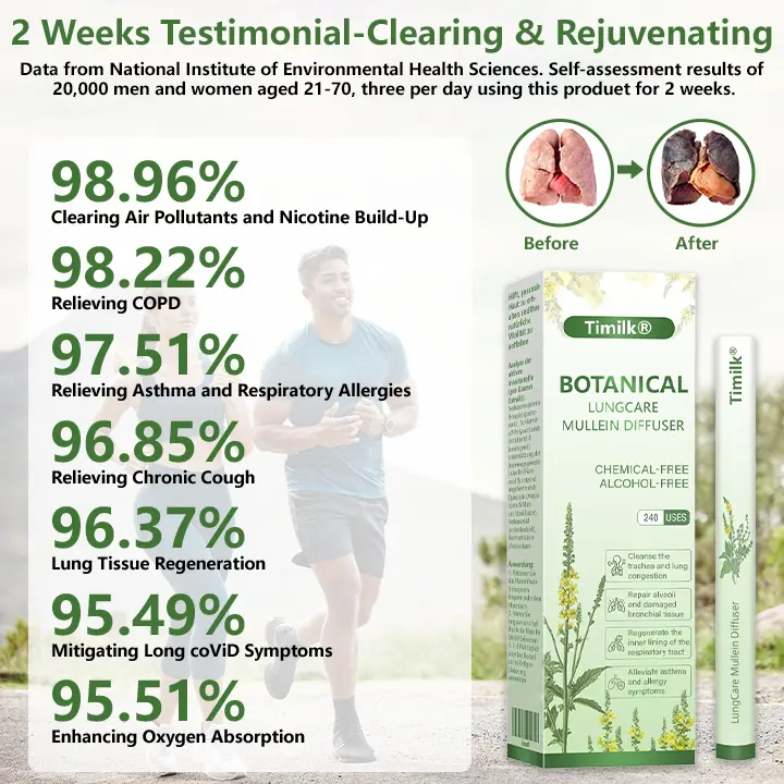 Customer studies show Timilk® Botanical LungCare Mullein Diffuser delivers powerful lung-supporting effects, especially for those exposed to smoking, industrial dust, and pollution. Users reported dramatic improvement in persistent coughing, shortness of breath, phlegm, and chest tightness.