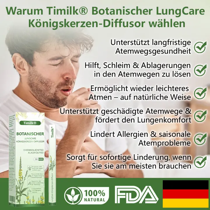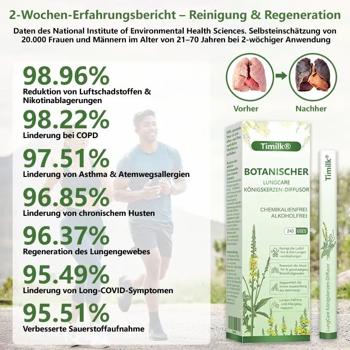 Im Gegensatz zu herkömmlichen Nahrungsergänzungsmitteln, die erst nach Stunden wirken, bietet Timilk® Botanical LungCare Königskerze-Diffusor eine klare Komfort-Zeitleiste. Innerhalb von 2 Minuten spüren Sie eine spürbare Linderung, da der Königskerzenextrakt direkt mit Ihrem Atemweggewebe in Kontakt kommt. Nach 2 Wochen regelmäßiger Anwendung lassen anhaltender Husten und Engegefühl in der Brust spürbar nach. Nach 4 Wochen werden Sie eine anhaltende Verbesserung Ihrer Atemwege feststellen – Sie können wieder frei atmen. Diese progressive Unterstützung wirkt mit den natürlichen Prozessen Ihres Körpers zusammen und sorgt für langfristiges Wohlbefinden, nicht nur für kurzfristige Linderung.