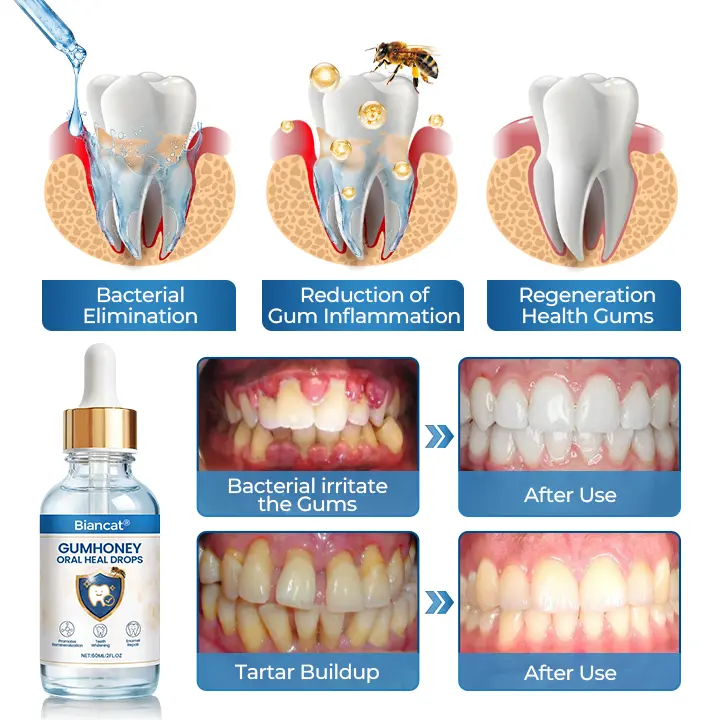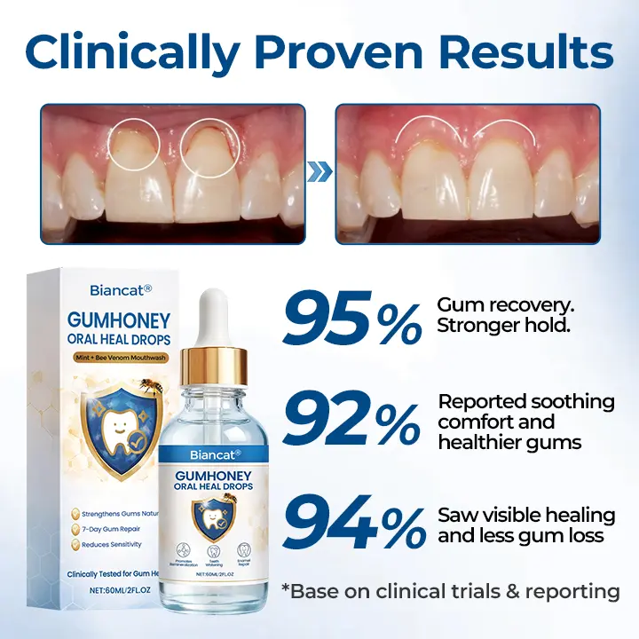 “I’ve struggled with gum inflammation for years — my gums would swell, bleed, and hurt whenever I brushed. A friend recommended Biancat® GumHoney Oral Heal Drops, so I decided to give it a try. After just a week, I noticed real improvement. The swelling has gone down, bleeding is almost gone, and my gums feel healthier and stronger. Thanks to this product, brushing and eating is no longer painful, and I finally feel confident about my gum health.”–Olivia Carter, 39