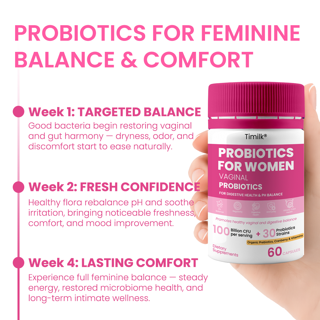 Discover the natural way to maintain vaginal health, pH balance, and comfort. Timilk® Vaginal Probiotics for Women is expertly formulated with clinically studied 100 Billion CFU, 30 Probiotic Strains and botanical extracts to nurture your microbiome and protect against imbalance, odor, and irritation — from the inside out.
